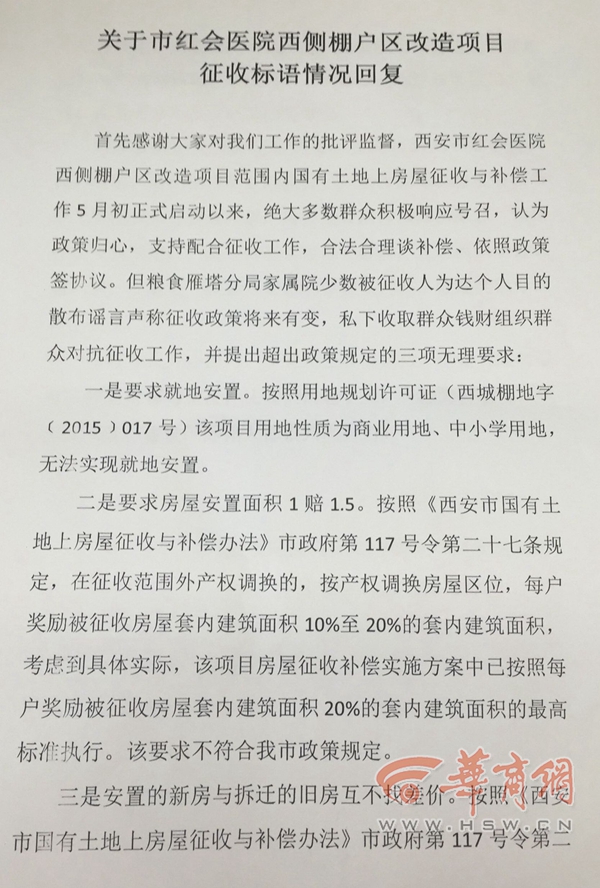 西安市紅會醫(yī)院西側(cè)棚戶區(qū)改造項目房屋征收補償工作指揮部對此事的回復(fù)
