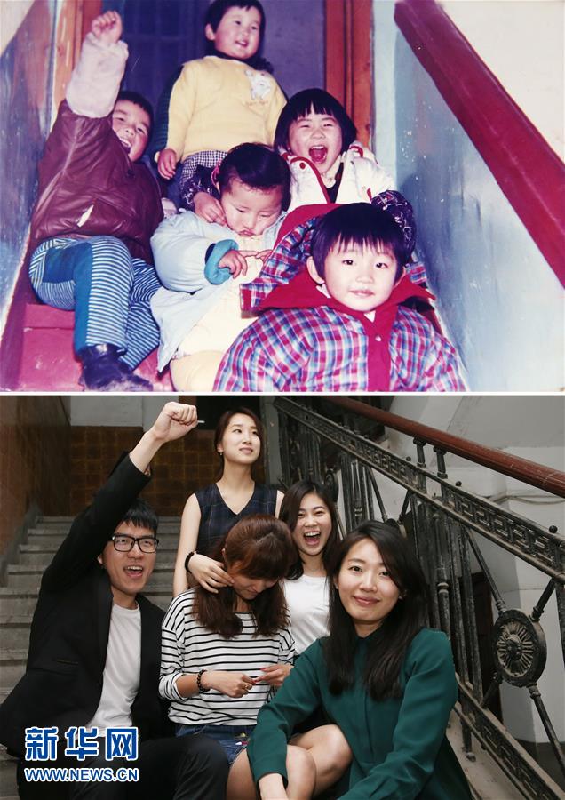 上圖:唐文磊(左一)和幾個小伙伴在上海市北蘇州路附近一幢大樓內的樓梯間合影(1992年攝,資料照片);下圖:5月25日,唐文磊(左一)和上圖中的小伙伴在上海市北蘇州路附近一幢大樓內的樓梯間合影(新華社記者 丁汀 攝)。新華社發(fā)