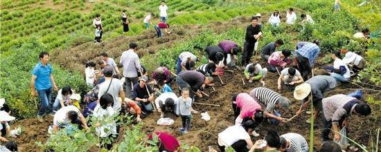 昨天,記者驅(qū)車來到了這個(gè)幾乎是磐安縣最東面的偏遠(yuǎn)鄉(xiāng)鎮(zhèn)胡宅,事實(shí)上,后張村就處于磐安和新昌交界的地方。中午時(shí)候,這個(gè)人口上千的村落幾乎已經(jīng)被各種各樣的車子停滿了,有奔馳越野車,也有面包車和電瓶車,有浙G、浙D、浙A等省內(nèi)牌照的,也有皖N的。這里的山頭傳說是死火山形成,所以土壤肥沃,幾乎整塊都被犁出來,種上莊稼,最多的是茶樹。一眼望去,尋寶的人員估計(jì)有六七百人,有人在挖,也有人是在圍觀。村民說,來來回回,當(dāng)天起碼涌進(jìn)來上千人在尋寶。