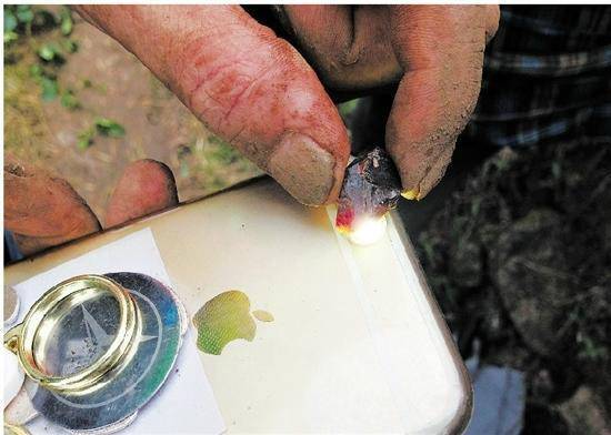 記者在現(xiàn)場(chǎng)看到,有人挖出五六顆還沒有指甲片大的小石頭,在手機(jī)燈下照了照,就被一女子以400元的價(jià)格買走。47歲的潘熙浩是磐安縣尖山鎮(zhèn)烏石村人,他是早上10點(diǎn)來的,兩三個(gè)小時(shí)的時(shí)間里,找到了兩顆指甲蓋大的石頭。