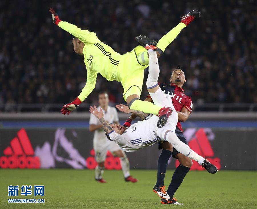 12月18日,皇家馬德里隊球員拉莫斯(下)、守門員納瓦斯與鹿島鹿角隊球員法布里西奧拼搶時撞在一起。新華社/美聯(lián)