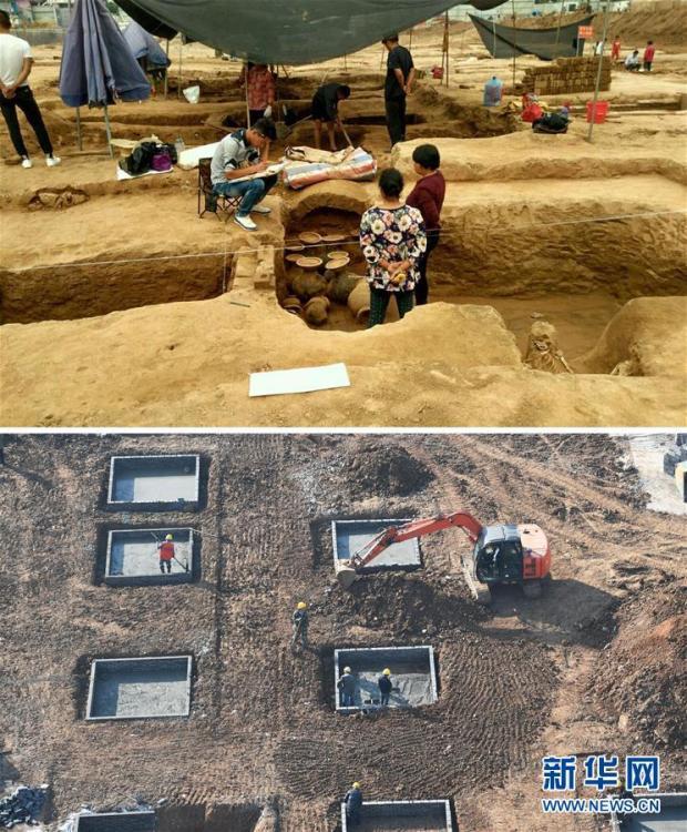 拼版照片:上圖為受訪者提供的河南汝州望嵩文化廣場(chǎng)漢墓群文物發(fā)掘現(xiàn)場(chǎng)照片(資料照片);下圖為12月8日拍攝的河南汝州望嵩文化廣場(chǎng)工地施工場(chǎng)面。 新華社記者 馮大鵬 攝 圖片來源:新華網(wǎng)