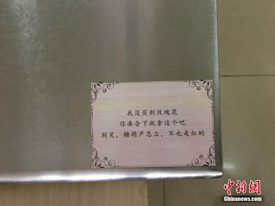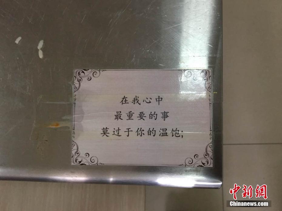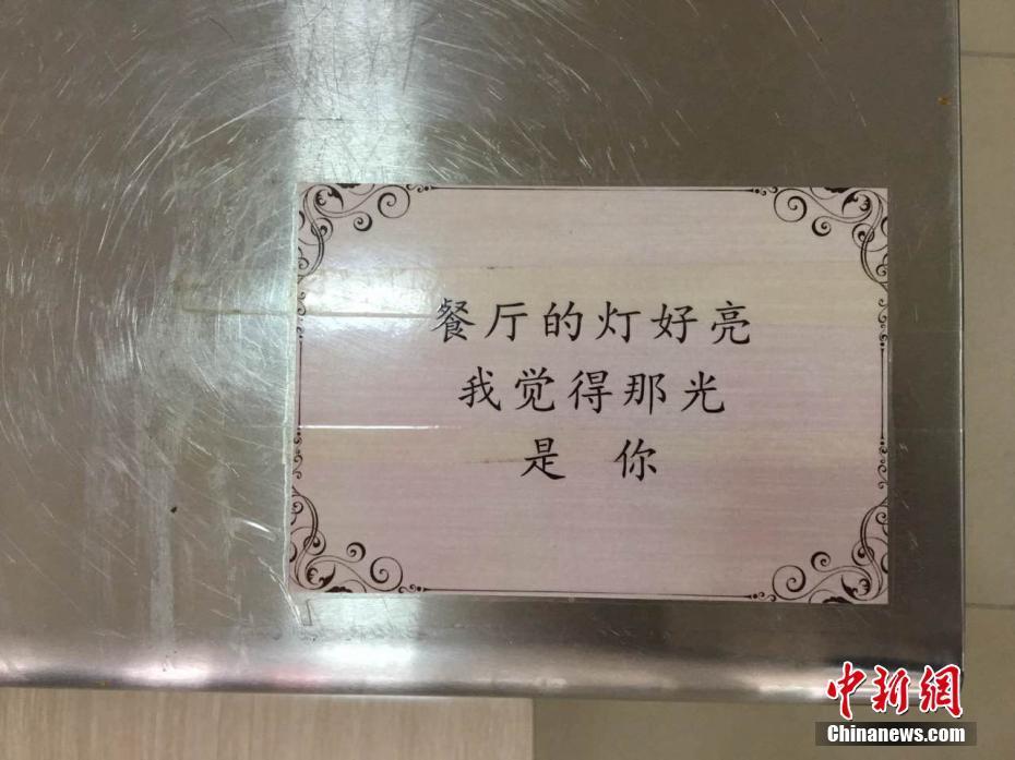 “這些情詩(shī)是開(kāi)學(xué)前貼上的,剛開(kāi)始只是想讓餐廳更個(gè)性化一點(diǎn)?!钡聦氹拚f(shuō),很多人覺(jué)得食堂就是個(gè)做大鍋菜的地方,吃飽肚子就行?!拔蚁爰右稽c(diǎn)不一樣的元素,就發(fā)動(dòng)朋友收集和吃飯有關(guān)的三行情書(shū)?!毖辔?阿琳娜 攝影報(bào)道