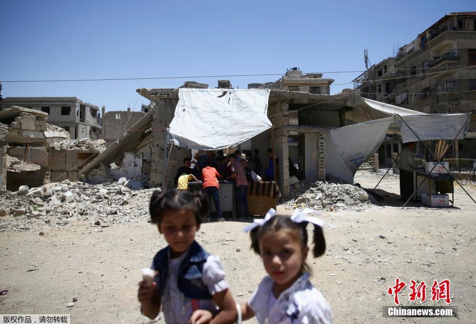 當(dāng)?shù)貢r(shí)間2017年6月26日,敘利亞反對派控制區(qū)杜馬,兒童慶祝開齋節(jié)。