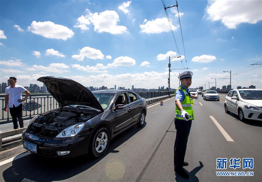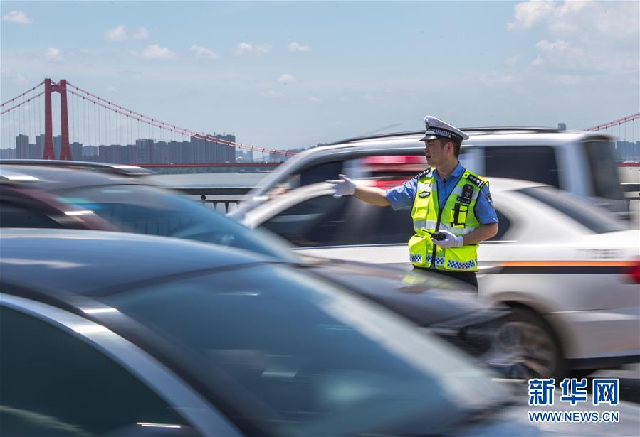 7月19日,武漢大橋大隊交警劉升在橋面上疏導(dǎo)交通。