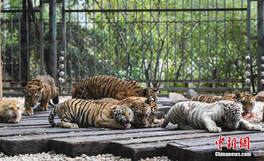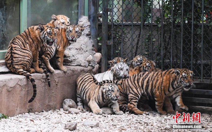 10月17日,濟(jì)南野生動(dòng)物世界2017年誕生的12只小老虎集中亮相,霸氣模樣吸引許多游客駐足觀賞。據(jù)悉,濟(jì)南野生動(dòng)物園2017年共繁育成活26只小老虎,其中2只是“虎中極品”金虎。 中新社記者 張勇 攝
