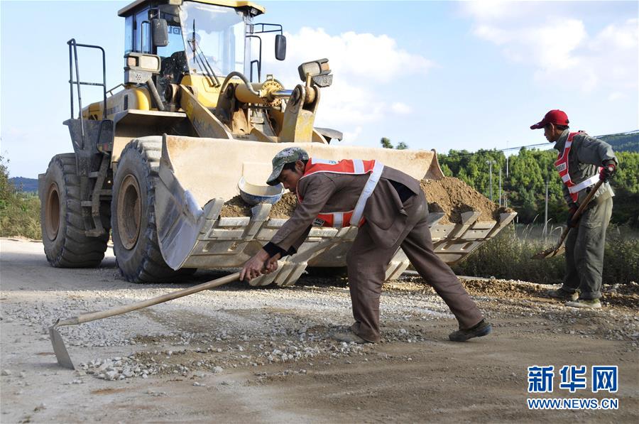 工人在云南省會(huì)澤縣駕車(chē)鄉(xiāng)的鄉(xiāng)村公路施工現(xiàn)場(chǎng)忙碌(10月20日攝)。