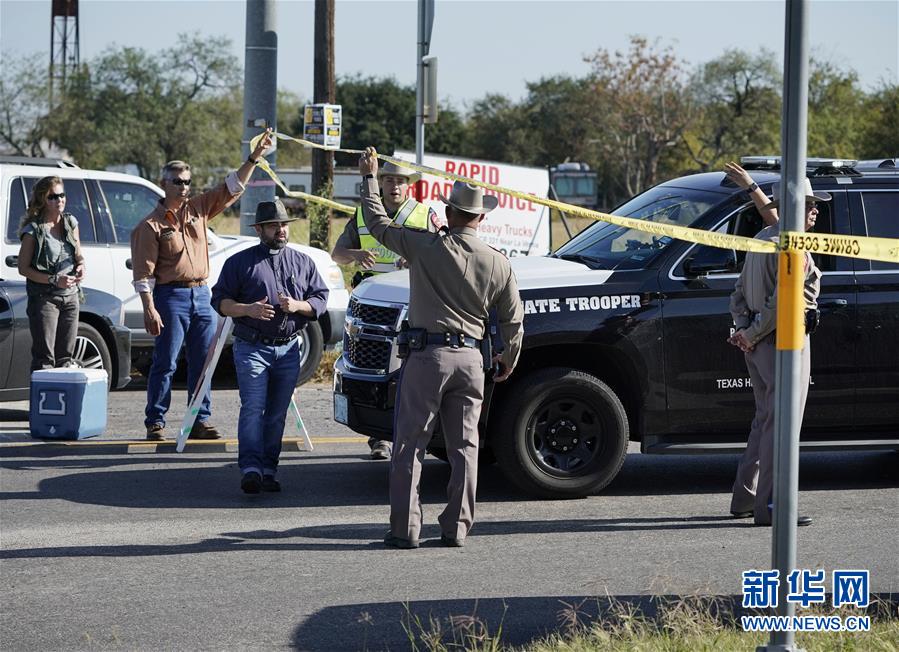 11月5日,在美國(guó)得克薩斯州南部薩瑟蘭斯普林斯鎮(zhèn),執(zhí)法人員在槍擊事件現(xiàn)場(chǎng)工作。美國(guó)得克薩斯州南部薩瑟蘭斯普林斯鎮(zhèn)一所教堂5日發(fā)生槍擊事件。警方向當(dāng)?shù)孛襟w證實(shí),槍擊至少造成27人死亡、多人受傷。 新華社/美聯(lián)