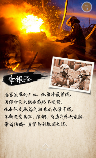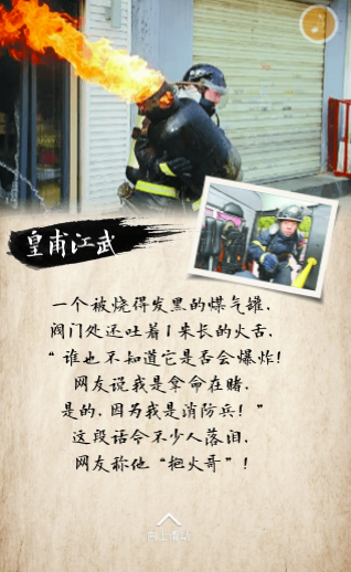 原本休假的他帶著兒子出去玩,偶遇火災,他將不滿兩歲的孩子托付給陌生路人照看,拿著滅火器,不顧個人安危,沖向樓頂滅火。他說:“我是消防員,不論任何時候,無論身上是否有軍裝!”