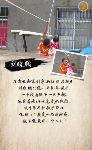 在湖北新寨村參與抗洪救援時,劉曉鵬只能一手托舉孩子,一手拽著繩子一點點挪。他冒著被洪水卷走的危險,咬牙單手把孩子帶回 ,他說:“我是一名消防員,絕不能放棄一個人!”