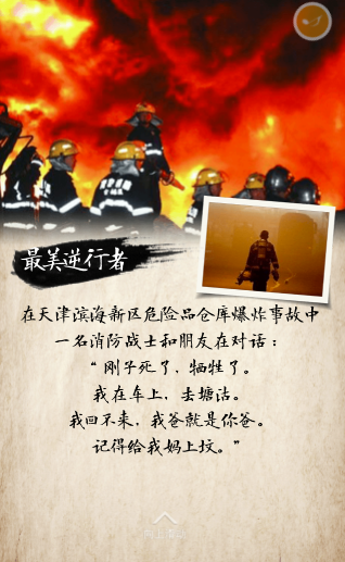 在天津濱海新區(qū)危險品倉庫爆炸事故中,一名消防戰(zhàn)士和朋友在對話:“剛子死了,犧牲了。我在車上,去塘沽。我回不來,我爸就是你爸。記得給我媽上墳?!?/p>
