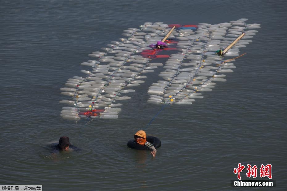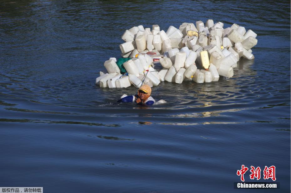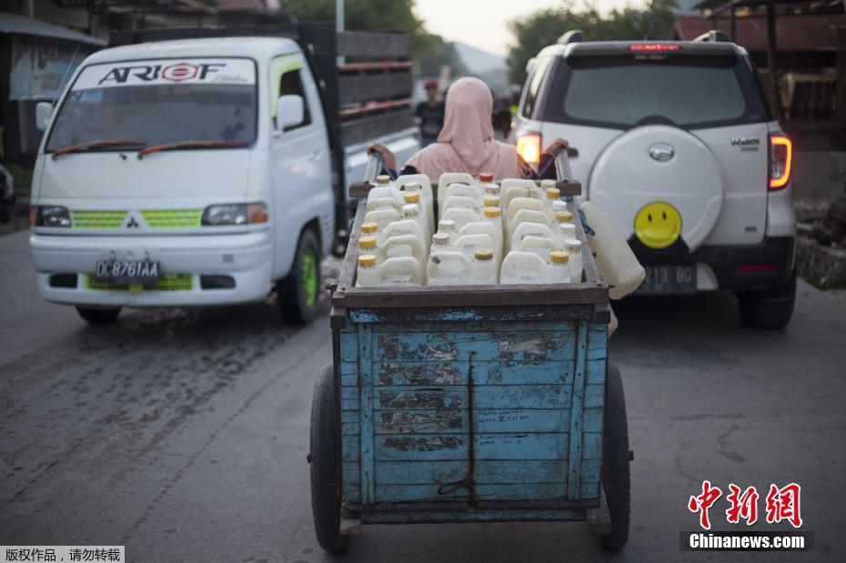 當(dāng)?shù)貢r間2018年3月21日, 印尼西蘇拉威西省Tinambung,村民Mama Hasria和其他當(dāng)?shù)嘏悦刻毂澈笙抵s200個空壺子逆流而上,到河上游為他們的社區(qū)打干凈的水。
