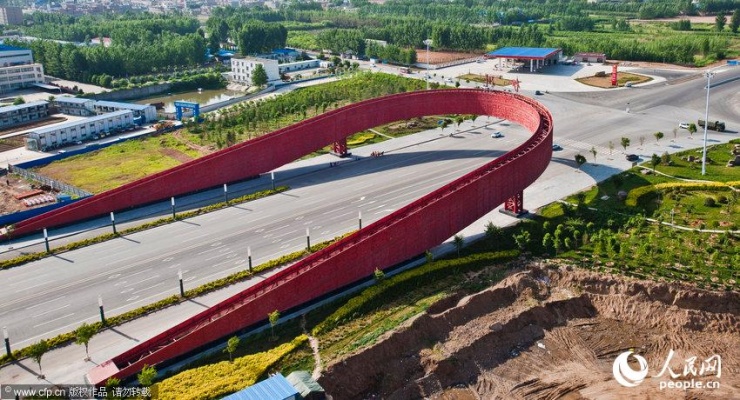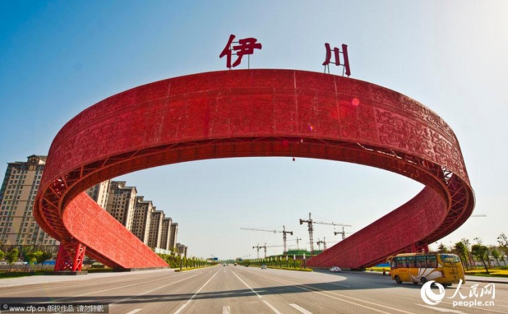 洛陽市伊川縣洛伊快速通道伊川界的伊川北大門建成,設(shè)計(jì)雷人,既像是一條紅腰帶,又酷似一個(gè)圈套,遭到網(wǎng)友虐稱:進(jìn)出城要鉆“褲腰帶”。