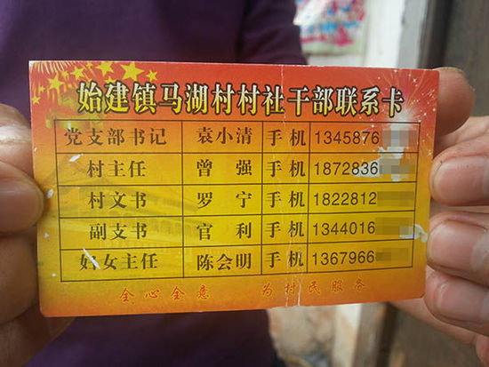 為方便聯(lián)系,村支書發(fā)放給村民們的聯(lián)系卡。