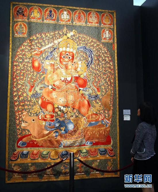 一位觀眾在香港佳士得2014年秋季拍賣會(huì)預(yù)展上觀看明永樂御制紅閻摩敵刺繡唐卡(11月21日攝)。新華社記者李鵬攝