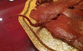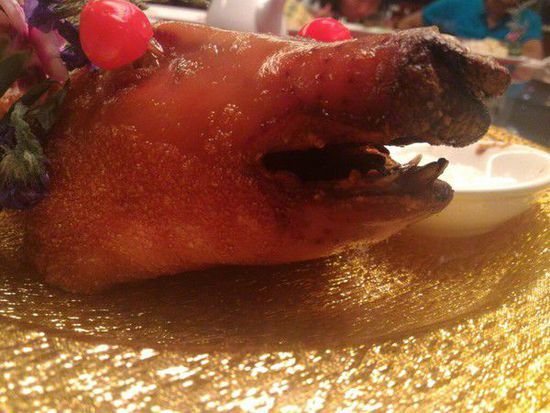 這名被嚇壞的網(wǎng)友,當晚將照片發(fā)到網(wǎng)絡,請大家來告訴他這到底是甚么動物。金黃色的盤子上放了“不知名的動物”,眼睛上被插了兩顆櫻桃,尾巴直挺挺的立著,似豬又如鼠一般。