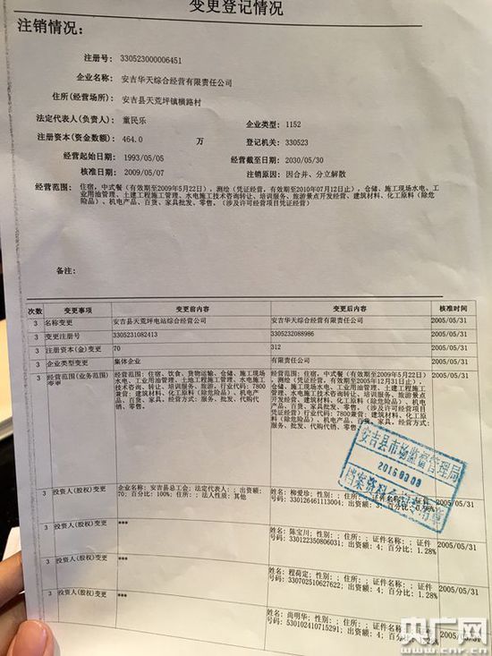 記者查詢安吉縣工商局登記信息發(fā)現(xiàn),江南天池度假村的前身就是天荒坪電站的三產(chǎn),天荒坪電站綜合經(jīng)營公司,在2005年前屬于集體企業(yè),之后這家企業(yè)多次變身,成為了浙江錢源旅游開發(fā)股份有限公司,江南天池公司就是錢源的全資子公司,2010年后,兩家企業(yè)的法人代表變?yōu)殡娬厩肮飨醢才唷?/p>