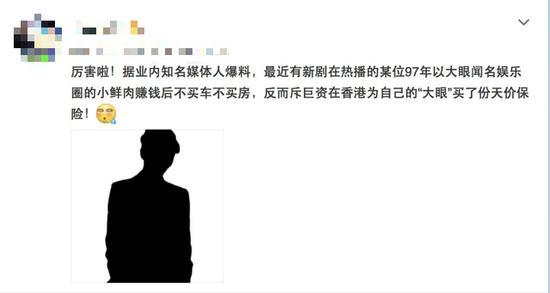5月1日,某大號在社交平臺爆料稱:“厲害啦!據(jù)業(yè)內(nèi)知名媒體人爆料,最近有新劇在熱播的某位97年以大眼聞名娛樂圈的小鮮肉賺錢后不買車不買房,反而斥巨資在香港為自己的“大眼”買了份天價保險(xiǎn)!”