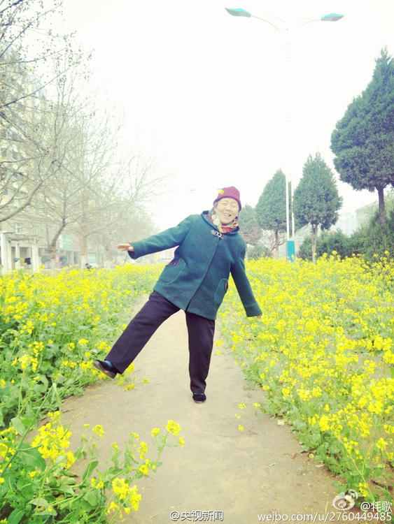 4月4日,網(wǎng)友“牦歌”在微博上曬出了一組照片,題為“你的皺紋比歲月更美”,照片的主角是“我奶奶”。一片金黃的油菜花田中,一位身穿灰色大衣,頭戴棗紅色線帽的老人或轉(zhuǎn)身回眸淺笑,或低頭輕聞花香,還45°角仰望天空,甚至單腳站立擺出“大”字狀。最可愛的要數(shù)老人擷取了一支油菜花插在耳邊,如果不是面龐已布滿皺紋,老人就如同一個(gè)嬌羞的小姑娘。圖為奶奶45°角仰望天空。