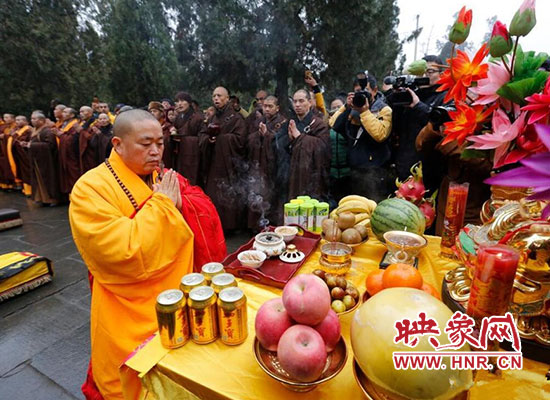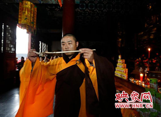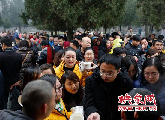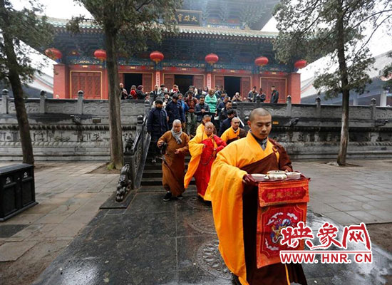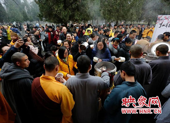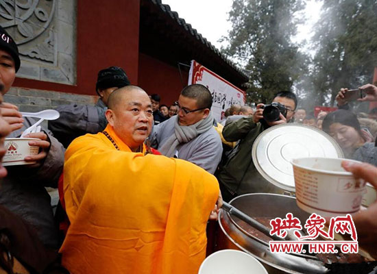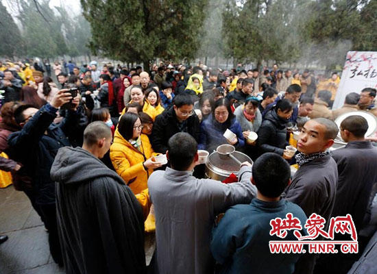2017年1月5日在河南省登封少林寺,少林寺臘八施粥并舉行祈福法會(huì),吸引數(shù)千名群眾前來喝粥。昨天是傳統(tǒng)的“臘八節(jié)”,隨著這一天的到來,年味漸濃,整個(gè)舊歷年年俗隨之拉開帷幕。