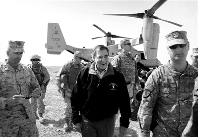 14日,正在阿富汗訪問的美國(guó)國(guó)防部長(zhǎng)帕內(nèi)塔乘軍機(jī)抵達(dá)一處軍事基地