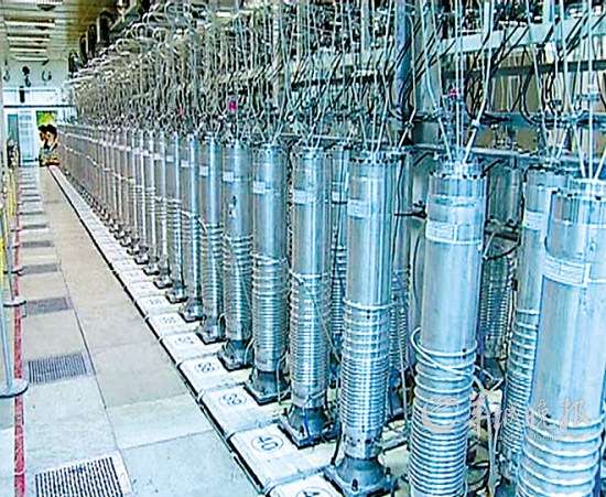 伊朗電視臺顯示了納坦茲核設施內的鈾濃縮設備(2012年2月15日拍攝)。
