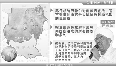 蘇丹國民議會(huì)本月16日通過決議,宣布南蘇丹政府為“敵人”,誓言武力奪回哈季利季油田。同時(shí),蘇丹軍隊(duì)出動(dòng)戰(zhàn)機(jī)轟炸南蘇丹境內(nèi)交通樞紐,為即將展開的大規(guī)模軍事行動(dòng)做準(zhǔn)備。南蘇丹提出,從哈季利季撤軍的先決條件是推翻海牙國際法院的有關(guān)裁決,宣布哈季利季地區(qū)歸屬存在爭議。此舉將為重新劃分上述地區(qū)埋下伏筆。