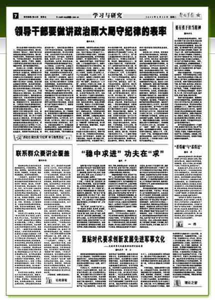 軍隊各級領(lǐng)導(dǎo)干部是部隊的帶兵人,無疑也應(yīng)當(dāng)成為講政治、顧大局、守紀(jì)律的“排頭兵”。領(lǐng)導(dǎo)干部只有自覺響應(yīng)胡主席提出的講政治、顧大局、守紀(jì)律的要求,積極參加學(xué)習(xí)教育活動,不斷強化政權(quán)意識、責(zé)任意識和憂患意識,高標(biāo)準(zhǔn)、嚴(yán)要求、做模范,才能帶領(lǐng)官兵把我軍真正建設(shè)成為軍魂意識牢固、履行使命堅強的軍隊。