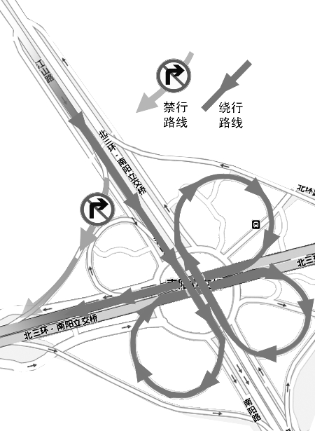 早晚高峰期從江山路由北向南上北環(huán)時,由于右轉上北環(huán)的路口在高峰期暫時封閉,建議沿北環(huán)立交橋由北向南一直行駛,從第二個口(標明往新鄉(xiāng)、開封方向)右轉行駛到北環(huán)立交橋由西向東方向,然后再右轉行駛到北環(huán)立交橋由南向北方向行駛,然后再右轉(標明往洛陽方向)回到北環(huán)立交橋由東向西方向,這樣在北環(huán)立交橋上經(jīng)過三次右轉后,完成從江山路向北環(huán)右轉的行駛需求。