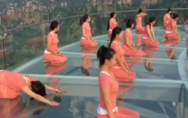實(shí)拍百人懸空玻璃觀景臺(tái)上練瑜伽