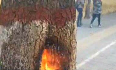鄭州:行道樹著火 大伙來撲救
