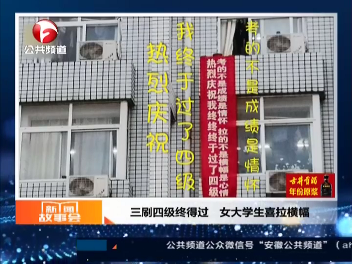 女大學(xué)生喜拉橫幅四級(jí)終得過