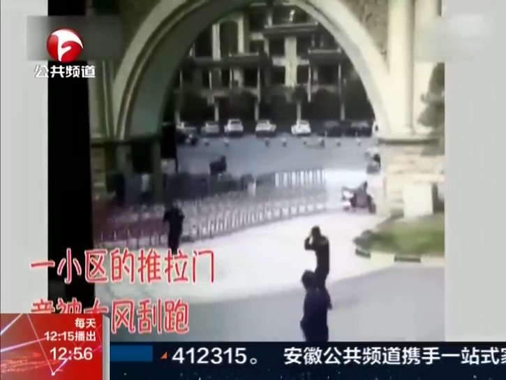 • 小區(qū)大門被風吹跑 保安緊追