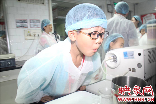 穿上白色的參觀服、戴上一次性帽子,受邀家庭進(jìn)入了檢測(cè)區(qū),參觀了質(zhì)量控制的檢測(cè)工作流程。正在工作的品控員,現(xiàn)場(chǎng)邀請(qǐng)了一名小朋友進(jìn)行了其中一項(xiàng)檢測(cè)--白利度檢測(cè)。“簡(jiǎn)單來(lái)講,就是利用密度儀,測(cè)試一瓶飲料的糖度和含氣量?jī)蓚€(gè)指標(biāo)?!逼房貑T張青介紹道。