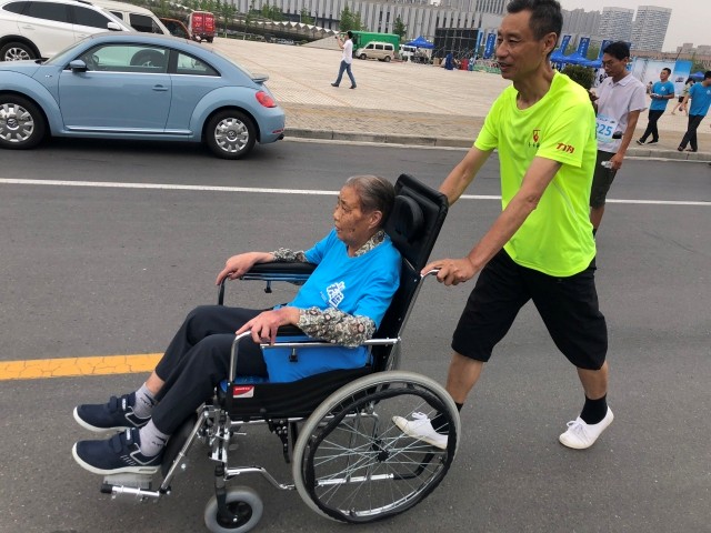 968歲兒子推著90歲老母一起奔跑
