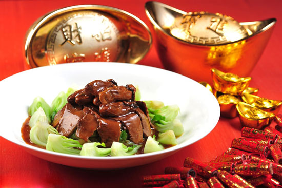 廣東人把年夜飯稱為“團年飯”,不但飯菜品種豐富,而且很講究意頭。一家人吃團年飯前要先祭祖或拜神,香燭燒完才開飯。席上一般有雞(寓有吉)、魚(寓年年有余)、蠔豉(寓好市)、生菜(寓生財)、腐竹(寓富足)、蒜(寓會計算)等以求吉利。廣東有的地方在吃團年飯時,若有新婚夫婦,會多擺一副碗筷,取來年添丁吉意。