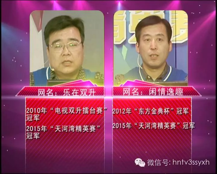 “樂在雙升”和“閑情逸趣”是一對老搭檔,城市對抗賽冠軍開封隊主力隊員,兩人搭檔曾獲得2015年天河灣精英賽冠軍。“閑情逸趣”曾獲得2012年東方金典杯冠軍,“樂在雙升”曾獲得2010年電視雙升擂臺賽冠軍。