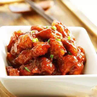 6.將油再次燒熱至沒(méi)有水的劈啪聲,倒入初炸的肉丁復(fù)炸至金黃色撈出控油。