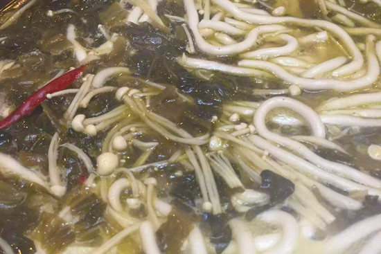 3.鍋中加入少許油,爆香蒜片、泡椒,加入料酒,隨后放入酸菜,超出酸菜的香味,然后加入開水,再放入金針菇和土豆粉,加入鹽、胡椒粉、料酒調(diào)味,中火慢慢煮,成熟撈出用來裝盆墊底。