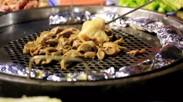 喜歡的食材都可以放進去烤,還要用特制的工具不停翻炒,以免一不留心肉類就糊鍋,一塊塊肉在鍋中來回翻烤,顏色變的焦黃滋滋冒著油,油汁肉汁蔬菜汁交融在一起,那味道單是想想就讓人心醉。