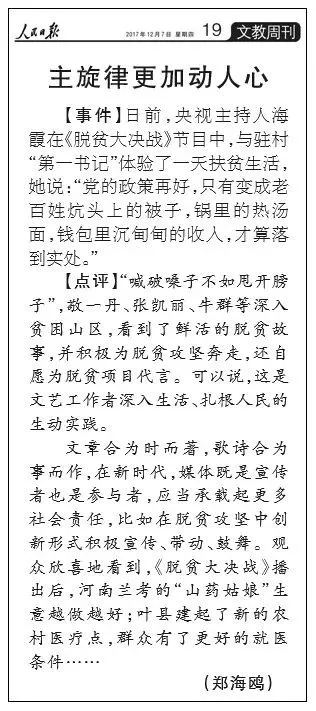 評論中還指出,文章合為時而著,歌詩合為事而作,在新時代,媒體既是宣傳者也是參與者,應(yīng)當(dāng)承載起更多社會責(zé)任,比如在脫貧攻堅(jiān)中創(chuàng)新形式積極宣傳、帶動、鼓舞。觀眾欣喜地看到,《脫貧大決戰(zhàn)》播出后,河南蘭考的“山藥姑娘”生意越做越好;葉縣建起了新的農(nóng)村醫(yī)療點(diǎn),群眾有了更好的就醫(yī)條件……