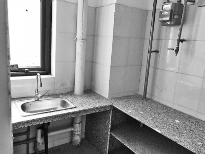 廚房里操作臺、灶臺、洗菜池已安裝到位。