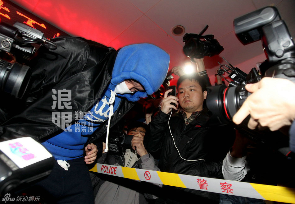 歌手李代沫吸毒被調(diào)查,18日晚,記者在派出所等候已久后,李代沫與警察現(xiàn)身派出所門口。李代沫戴帽衫蒙面低調(diào),拷著手銬被押解到朝陽分局。(鄭福德/圖)