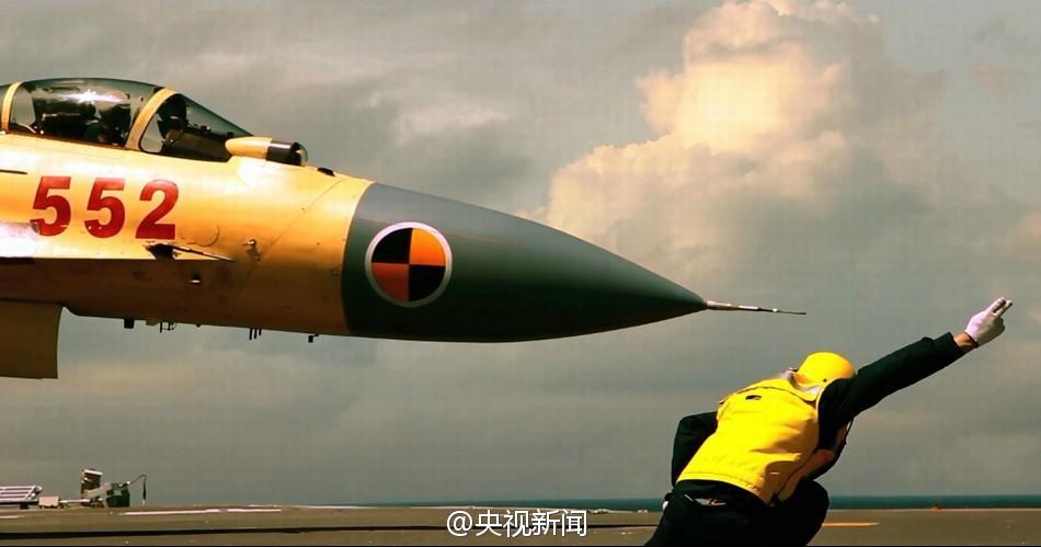 昨天,央視新聞首先在節(jié)目中播出這一視頻。視頻配以恢宏的音樂,記錄了殲15艦載機在遼寧艦上起飛、著艦的畫面。視頻以飛行員的日?;居柧氉鳛殚_頭,描述了飛行員做起飛前的準備工作、飛行中駕駛飛機及著陸的狀態(tài)。值得注意的是,視頻中,還有近10秒時間展示了殲15在空中進行特技飛行動作的畫面,飛行員駕駛飛機進行翻轉,畫面中天空與地面的位置調(diào)轉。