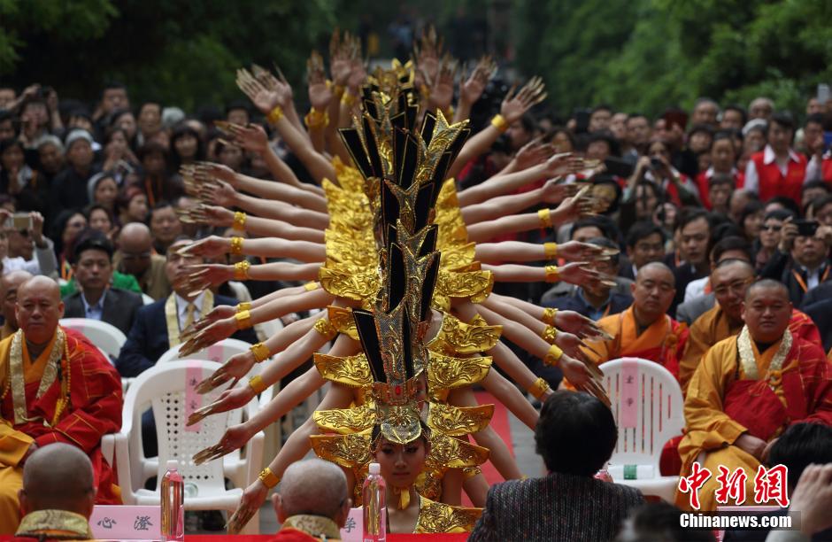 4月28日,演員在金陵禮佛月開幕式上表演節(jié)目《千手觀音》。當(dāng)日,南京靈谷寺開山1500周年慶典暨第四屆金陵禮佛文化月開幕式在紫金山靈谷寺公園無梁殿前舉行。據(jù)悉,禮佛文化月期間還將舉行佛頂骨舍利的恭請法會、諸圣舍利迎請法會、講經(jīng)說法、南京國際佛事用品展覽會等系列活動。中新社發(fā) 泱波 攝