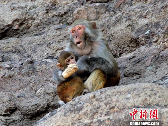 一只母猴帶著小猴在懸崖上吃玉米?!埛z