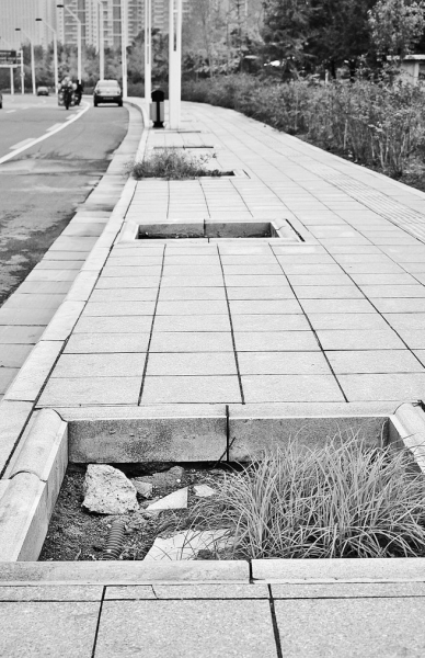 樹坑內(nèi)沒有種樹,長了野草。