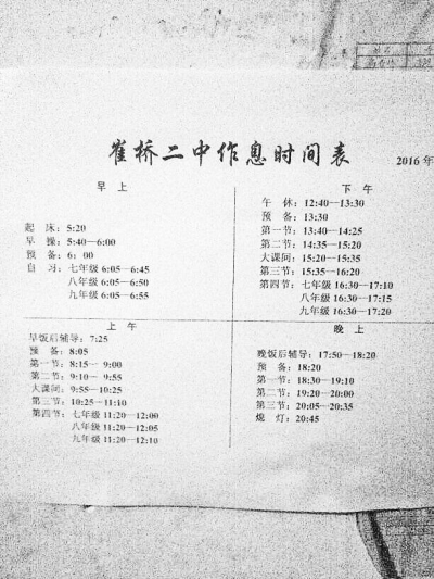 悲痛之余,佳佳的伯伯質(zhì)疑學(xué)校規(guī)定的作息時(shí)間存在不合理狀況。記者從其提供的該校作息時(shí)間表上看到,該校針對(duì)所有學(xué)生規(guī)定的早上起床時(shí)間是凌晨5時(shí)20分,早操是5時(shí)40分至6時(shí)整,然后是早自習(xí)。