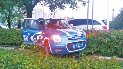 昨日上午10時(shí)許,大河報(bào)記者跟著鄭州市公安局交巡警支隊(duì)直屬六大隊(duì)民警,來到鄭東新區(qū)CBD如意湖畔的千璽廣場。事故發(fā)生地點(diǎn)位于千璽廣場西南側(cè)的一處廣場上,這里有一處共享汽車停車場。記者發(fā)現(xiàn),這里共有6輛共享汽車,出事的豫A5A32B共享汽車是一輛藍(lán)白色搭配的力帆汽車,停在綠化帶內(nèi),車身有碰撞痕跡。停車場東北角,一輛白色豫A牌照奔馳轎車左前臉位置受損。