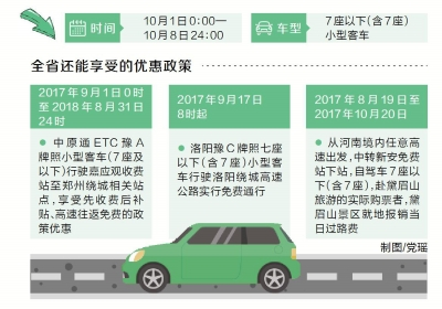 同時,全省還能享受到除高速免費以外的其他優(yōu)惠政策:從2017年9月1日0時至2018年8月31日24時,中原通ETC豫A牌照小型客車(7座及以下)行駛嘉應觀收費站至鄭州繞城相關站點,享受先收費后補貼、高速往返免費的政策優(yōu)惠;2017年9月17日8時起,洛陽豫C牌照7座以下(含7座)小型客車行駛洛陽繞城高速公路實行免費通行;2017年8月19日至2017年10月20日,從河南境內任意高速出發(fā),中轉新安縣下站,自駕7座以下(含7座)小型客車赴黛眉山旅游的實際購票者,黛眉山景區(qū)就地報銷當日過路費。